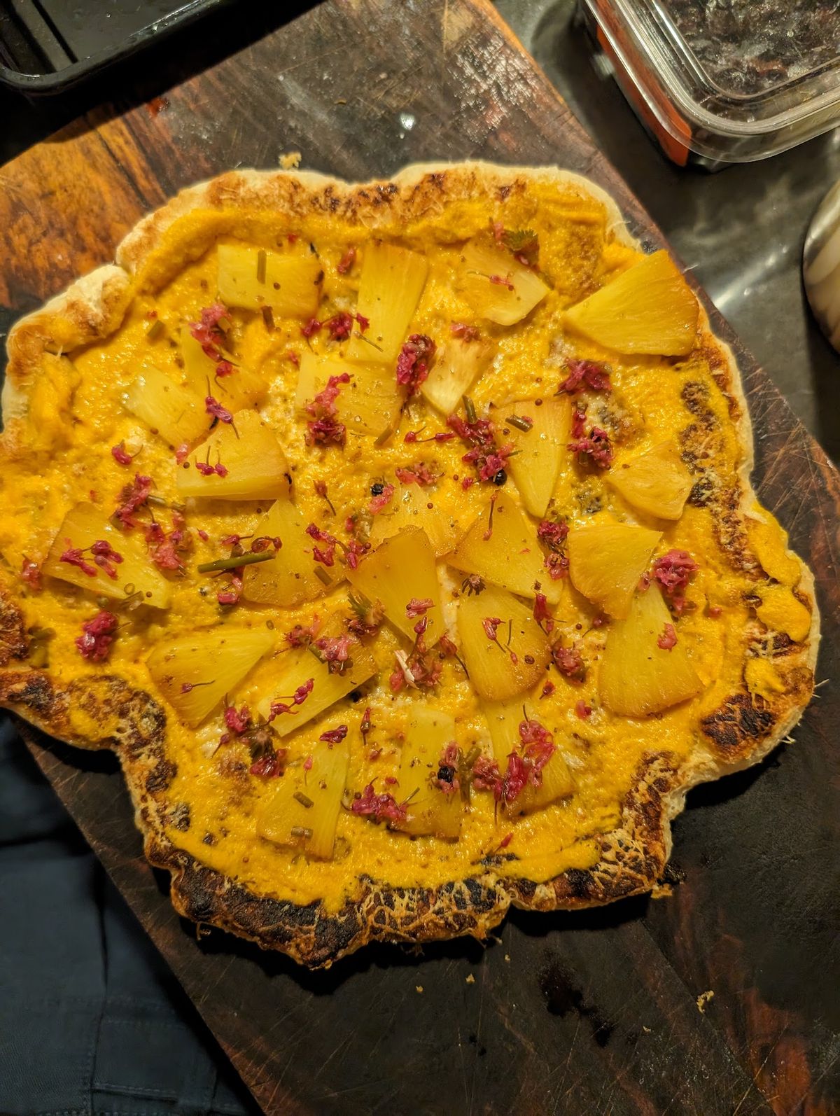 ↩ index ?? /3 Ratings Ingredients Chive blossoms Carrot sauce Roasted pineapple Pecorino Bacon salt Fermented honey garlic stuffed crust It could've supported truffle It could've supported truffle It could've supported truffle It could've supported truffle