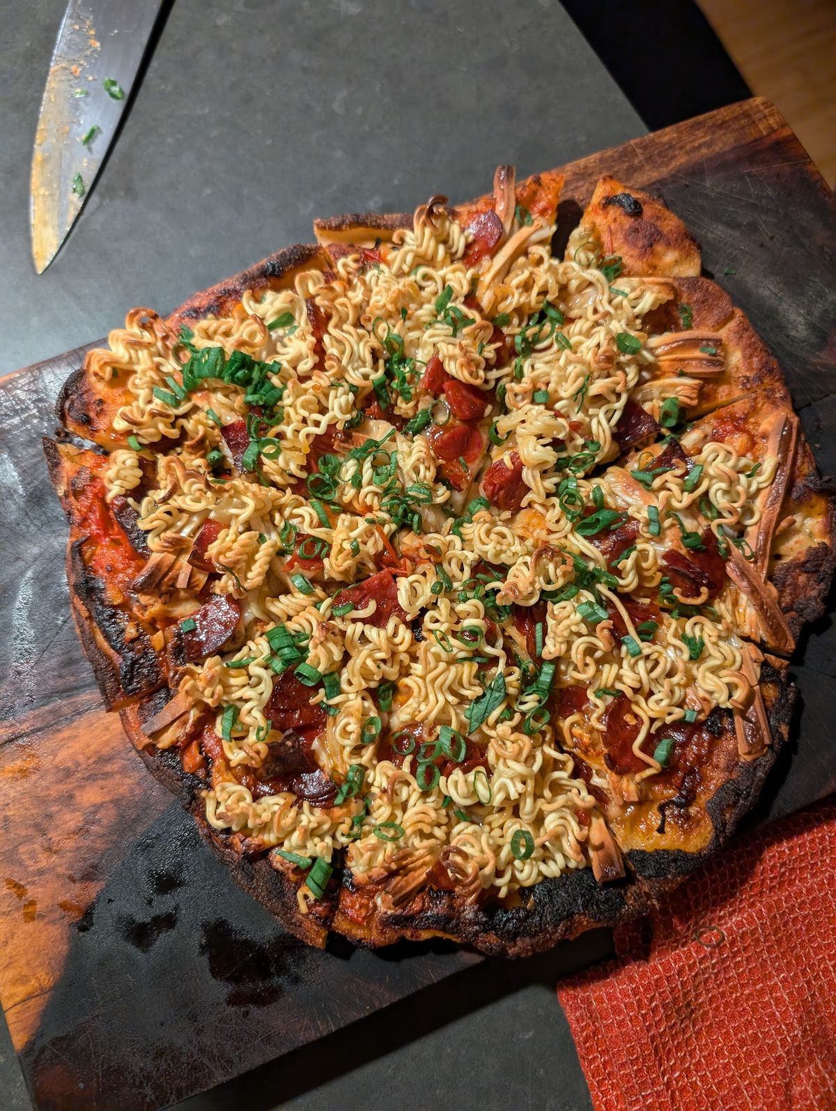 - Cheddar ramen powder massaged crust Raw uncanned tomatoes sauce Fish cod camembert Hot uncured sopresata Everybody loves ramen noodle Green onion scallion Chili oil fish sauce fermented honey Soy sauce