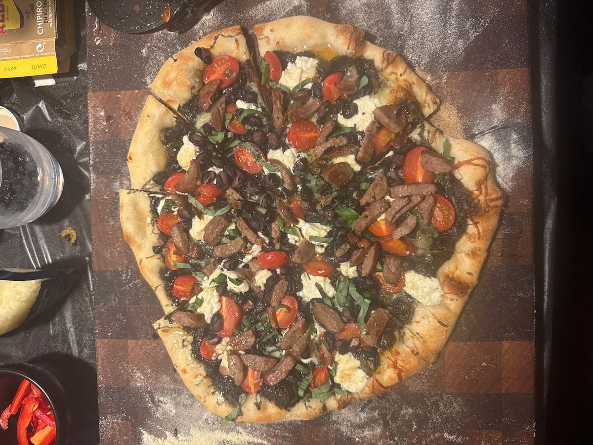 - White dough Persimmon salsa verde Black cheese 5 Italian cheese Goat sheep cheese Cherry tomatoes Black beans Topped with duck sausage Persimmon salsa verde green tomato mostarda Fresh basil Sponsored by self loathing Italian Haters Committee Ps this is not kosher for Passover and for some people that might be important to know