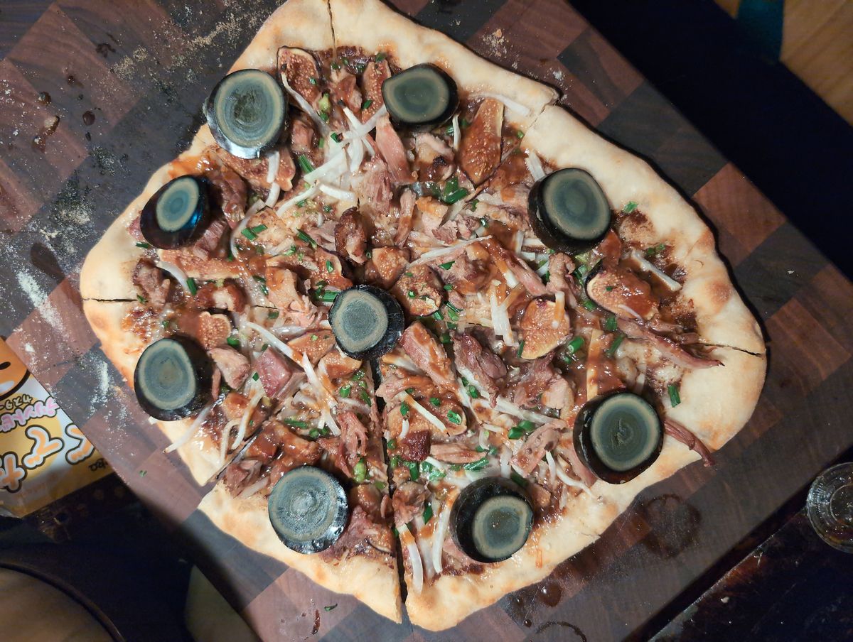 - Figs Dook Preserved Apricot stew Chinese chive kohlrabi Diet Coke Hoisin ume saoce Thousand year duck egg Parmesana orecchiette